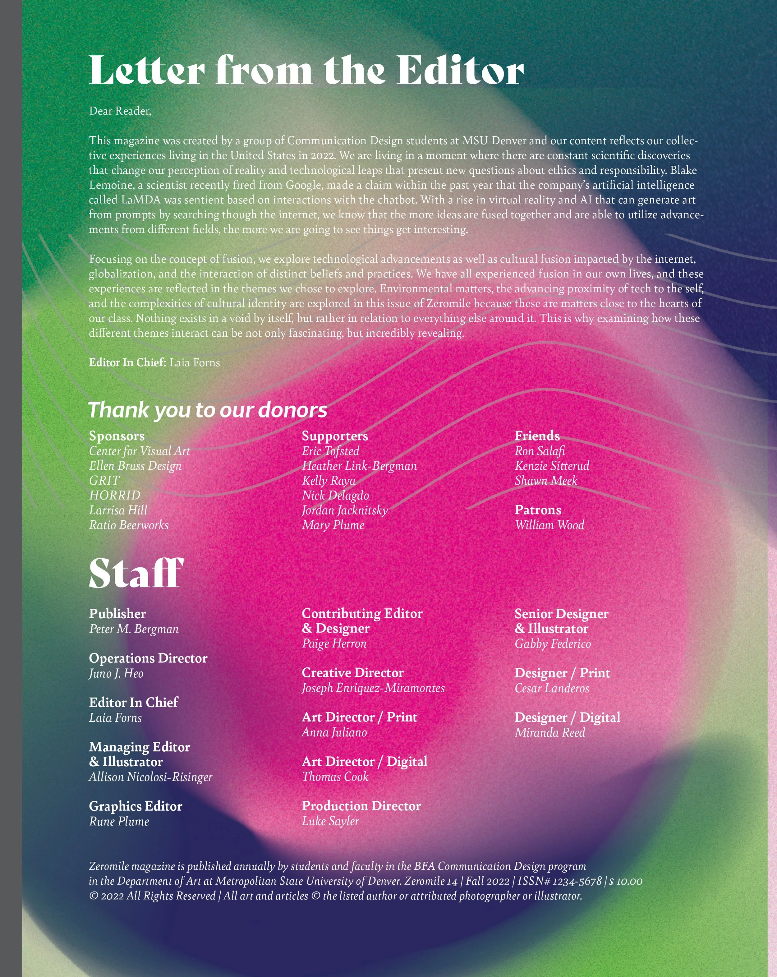 The goal of this class was to create a full magazine from start to finish within one semester, mirroring the workflow of a real publication team. Each student took on a specific role- I served as Art Director, guiding the visual direction while also contributing a “Letter from the Editor” page, a two-page spread, and an original article.